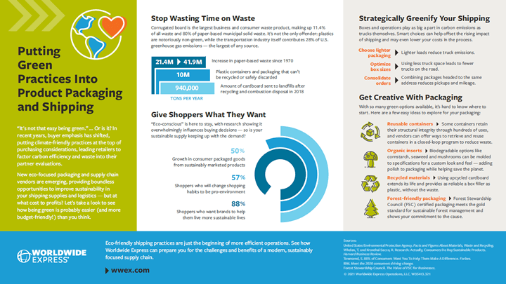 Check out our infographic to learn how sustainable packaging is an easy-to-implement practice for your supply chain. And when you're ready to give green a go with an EPA Smartway registered partner, reach out to Worldwide Express and one of our shipping experts will help you build a parcel shipping strategy even a Mother (Earth) could love.